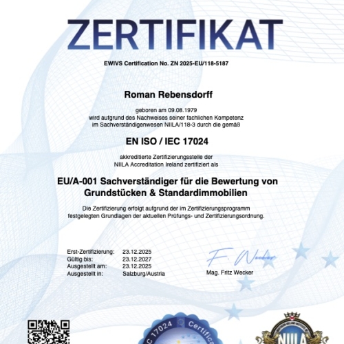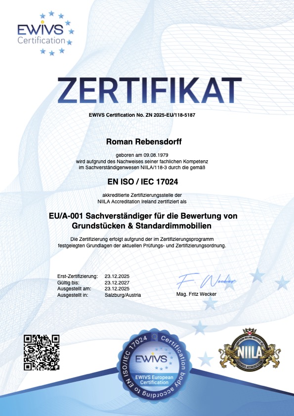 Roman Rebensdorff ist diplomierter und zertifizierter Gutachter für Immobilienbewertung mit Schwerpunkt auf Verkehrswertgutachten, Hausbewertungen und gerichtsfesten Wertermittlungen. Als professioneller Sachverständiger erstellt er fundierte Immobiliengutachten nach ImmoWertV und gemäß § 194 BauGB - rechtssicher, objektiv und unabhängig. Die Tätigkeit erstreckt sich über weite Teile Bayerns, insbesondere über die Landkreise Freyung-Grafenau, Regen, Deggendorf, Passau, Straubing-Bogen, Cham, Rottal-Inn und Dingolfing-Landau sowie über Städte wie Passau, Deggendorf, Straubing, Regen, Freyung, Grafenau, Cham, Zwiesel, Waldkirchen und Spiegelau.